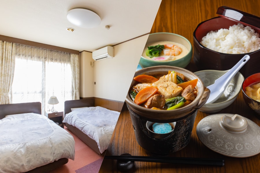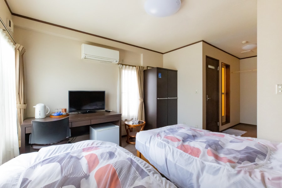 お部屋ごとにユニットバスとトイレが付いた、ツインルームです。ベッドのお部屋でゆったり滞在いただけます。